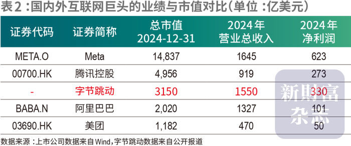 还有报道指,2024年,字节跳动营收达1550亿美元(折合1.13万亿元人民币),同比增长29%,净利润达330亿美元。若以此衡量,其可晋级国内互联网科技企业NO.1,超过阿里巴巴和腾讯,且营收规模逼近脸书母公司Meta。而Meta估值达1.5万亿美元,腾讯估值5000亿美元,字节跳动或是业绩增速更高,但估值仍显著低于Meta、腾讯等(表2)。若TikTok突破限制、构建“内容+电商”模式闭环,张一鸣的身家当还有向上空间。