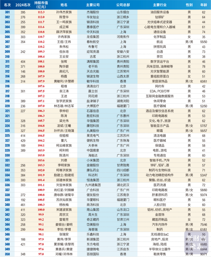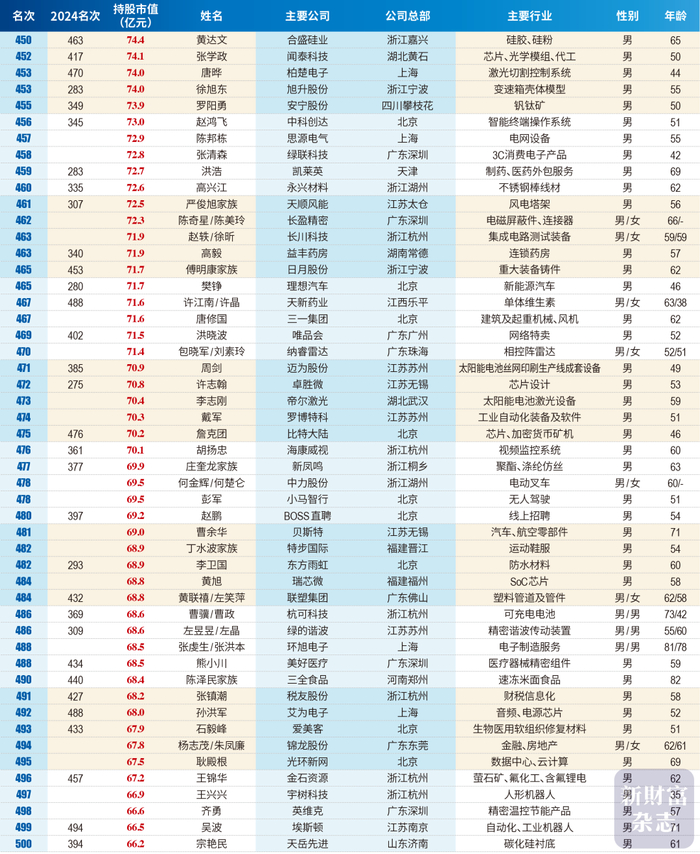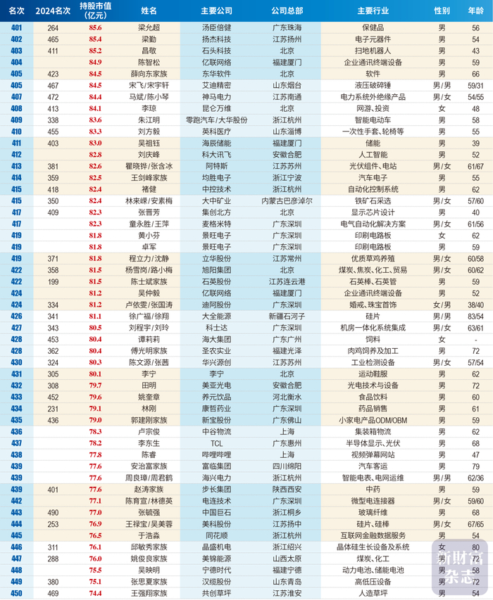 AI算力去年造就了河北女首富润泽科技周超男,今年,周超男持股市值再次翻倍,以410亿元跻身榜单前100名。此外,光环新网的耿殿根凭借数据中心业务,罗博特科的戴军凭借英伟达供货商概念,成功上榜。