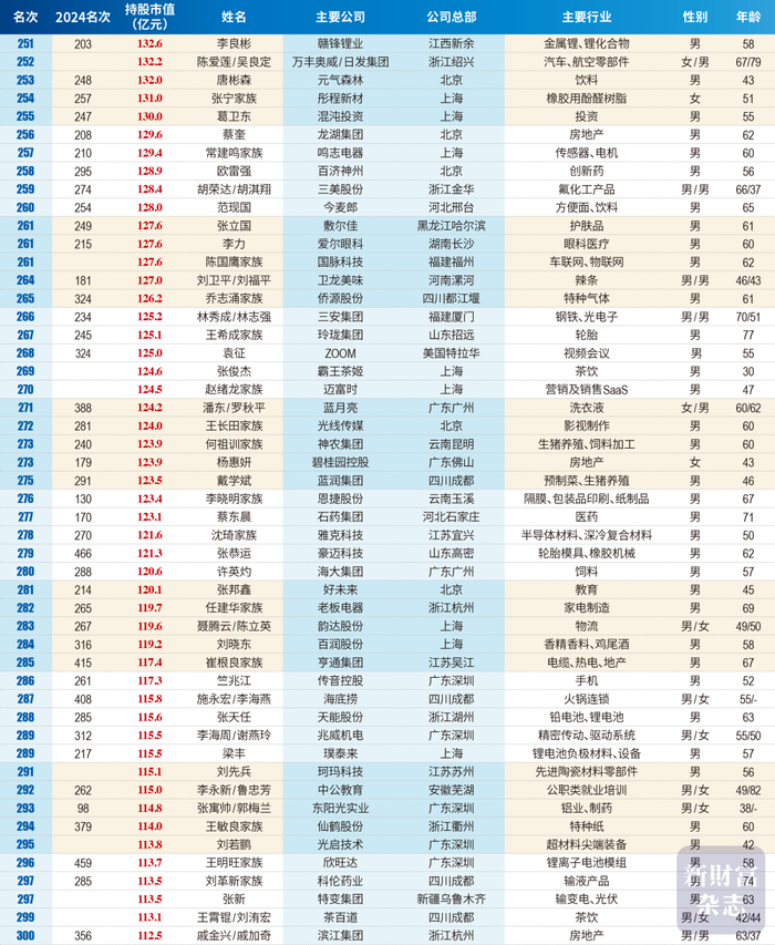 创新与出海拉动下,中国民企的价值创造能力加速释放,新一轮创富春潮正澎湃涌动。今年上榜的500位企业家或家族持股总市值达到13.7万亿元,同比上涨11%,均值为273.8亿元,上榜门槛为66.2亿元,有341人的身家在百亿以上。
