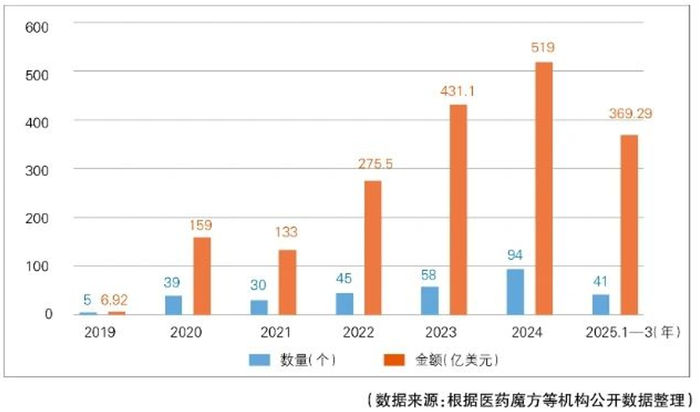 2024年我国共达成94起新药的License-out交易(指药企(授权方)将自主研发的药物专利、技术或商业化权益,通过合同授权给海外药企(被授权方),允许其在特定区域内进行开发、生产或销售,授权方则通过首付款、里程碑付款及销售分成获取收益), 出海交易总金额高达519亿美元,同比增长26%。在2025年一季度,国内已经达成41笔License-out交易,总金额达369.29亿美元,均再创同期历史新高,其中多笔是与跨国巨头的合作大项目(数据来源:医药魔方,2025.3.31)。