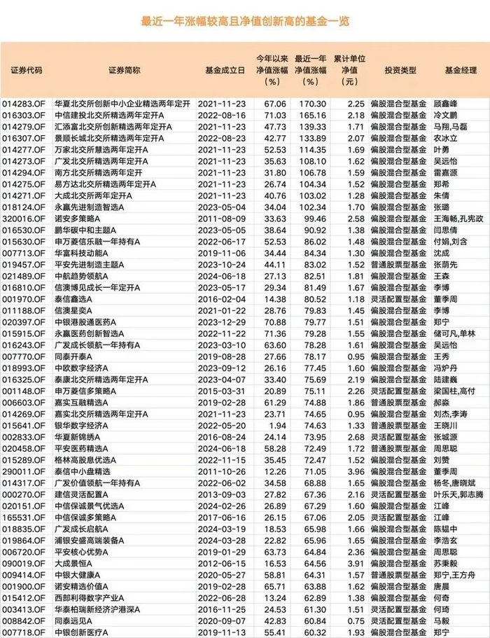 Wind数据显示,截至6月23日,共有106只主动权益基金(仅统计主代码,下同)净值创出成立以来新高。从业绩表现来看,这批主动权益基金中,有91只基金年内涨幅超过30%,其中,24只年内涨幅超过50%,更有10只年内涨幅超过60%,展现出较好的超额收益获取能力。从过去一年的时间维度看,有10只基金净值翻倍,有23只基金涨幅超过70%,涨幅超过50%的基金多达93只。这些净值创历史新高的产品既有当下热门的行业主题基金,如北交所精选两年定开基金、医药基金、红利基金等,还有一些成立时间不久的次新基金,这些基金成立于调整期,净值回撤不大,同时基金已经把握住了一定的结构性行情。(中国基金报)
