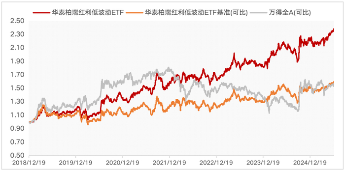备注:华泰柏瑞红利低波ETF成立于20181219,2020年-2024年收益依次为9.46%、19.56%、2.72%、11.91%、22.64%。业绩比较基准为:中证红利低波动指数收益率,同期收益分别为-2.96%、10.80%、-1.90%、6.45%、17.84%。历任基金经理:柳军(20181219至今)。以上数据摘自基金定期报告。