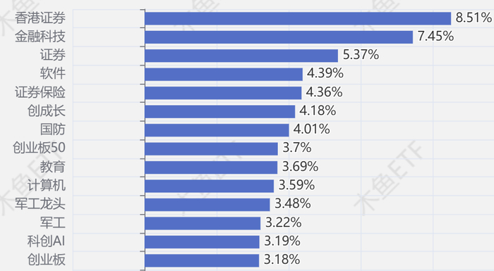 从周三主题表现来看,证券系(含金科)独占鳌头之外,有利好(军演)刺激的军工、人气主题创业板、科创等也有优异表现。