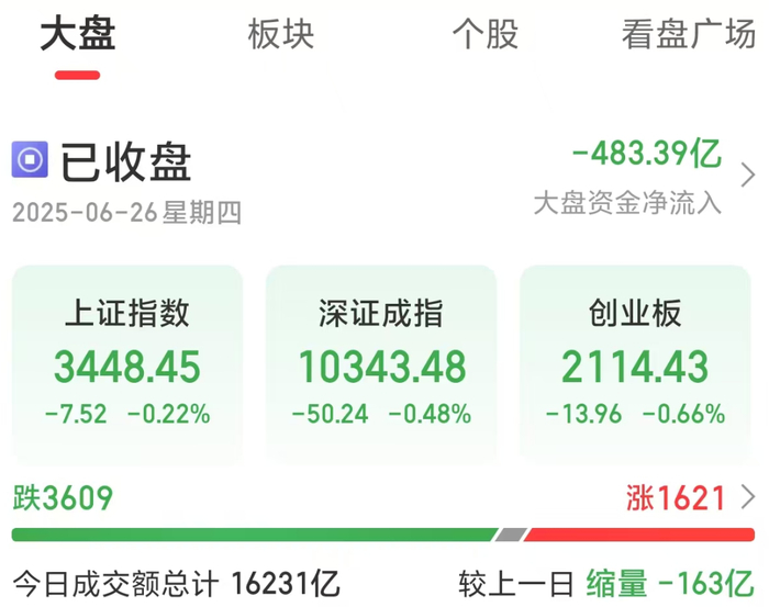 今日A股三大指数集体下跌,沪指跌0.22%,点位仍在3400点上方,深成指跌0.48%,创业板指跌0.66%。全市场成交额16231亿元,较上日缩量163亿元。