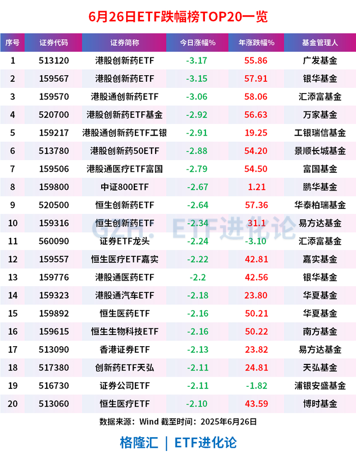 今日港股三大指数全线飘绿,连续三日反弹的港股创新药主题ETF跌幅居前,港股创新药ETF、港股通创新药ETF均跌逾3%。