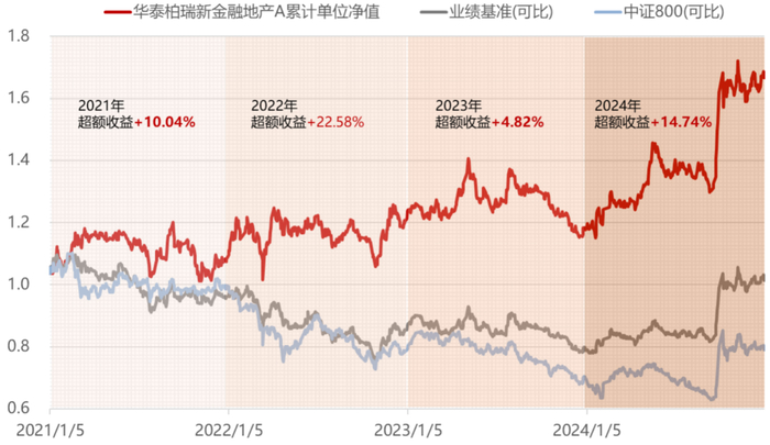 累计单位净值来源:华泰柏瑞,经托管行复核,年度业绩、年度业绩基准、年度超额收益数据来源:定期报告,区间:2021/1/5-2024/12/31;基金的过往业绩并不预示其未来表现,基金管理人管理的其他基金的业绩并不构成本基金业绩表现的保证。华泰柏瑞新金融地产与华泰柏瑞红利精选混合在投资范围、策略、比例等方面存在差异。
