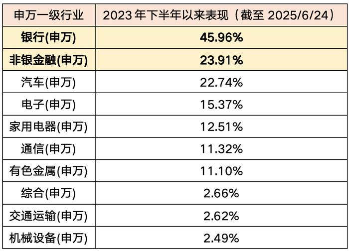 但就是这样的冷门板块,近年来却取得了较为优异的表现。Wind数据显示,自2023年下半年以来,在申万31个一级行业中,表现前二的一级行业分别是金融板块的银行(45.96%)和非银金融(23.91%)。