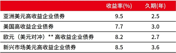 在高收益企业债券方面,亚洲高收益债的收益率相对具有吸引力,超过9%,久期方面只有2.5年,也是四个主要区域中最低的,且信用利差收缩潜力更大。