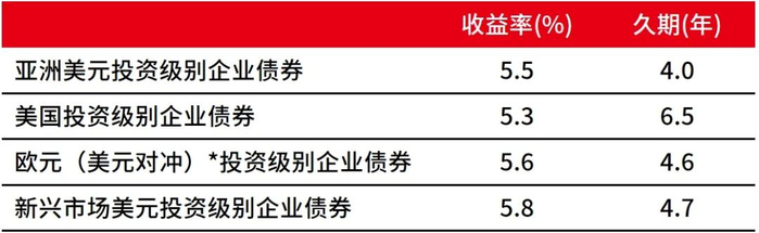 资料来源:彭博、摩根大通,2025年6月9日。投资涉及风险。过去的表现不代表未来的表现。仅供说明。收益率水平不获保证且未来可升或可跌。指数回报假定所有分配均用于再投资,不反映费用或开支。您不能直接投资于指数。所提供的信息仅供说明。亚洲美元投资级别企业债券-摩根大通亚洲信贷指数(投资级别);美国投资级别企业债券-洲际交易所美银美国企业债券指数;欧元(美元对冲)投资级别企业债券-洲际交易所美银欧元企业债券指数;新兴市场美元投资级别企业债券-摩根大通新兴市场企业债券广泛多元化指数(高级别)。