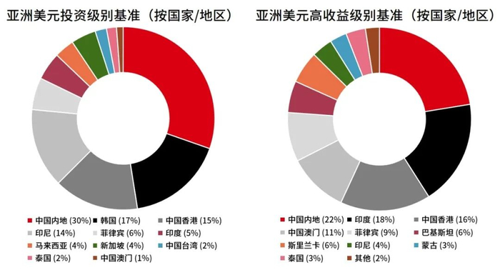 亚洲美元投资级别债券的基准当中,占前三的有中国内地、韩国和中国香港,其他还有印尼、菲律宾、印度、马来西亚、新加坡及其他国家或地区。高收益级别的基准当中,前三大是中国内地、印度和中国香港,其他还有中国澳门、菲律宾、巴基斯坦、斯里兰卡、印尼、蒙古、泰国等等。