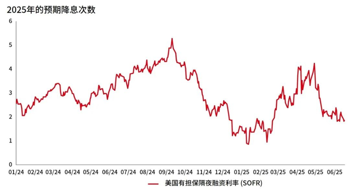 近两个月,各种数据显示,随着各种关税政策的推出,美国消费者信心开始下降,并已达到近3-4年来的最低点。最近美国延迟向世界各国征收对等关税,相关的消费者信心指数也有所回升。虽然市场对美国降息的预期比4-5月那个时候的(2025年内降息)3-4次已经下降,但仍预期今年会有两次降息的机会。