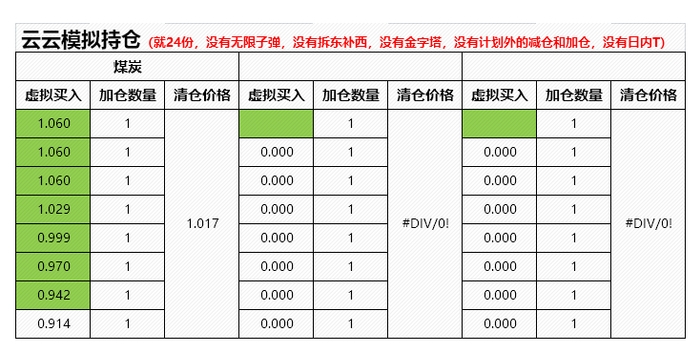 清仓收益按24份底仓计算,5个月清仓收益率大约5.38%。年化11%左右。目前持有煤炭 。其他两个品种空缺。耐心等待市场调整。