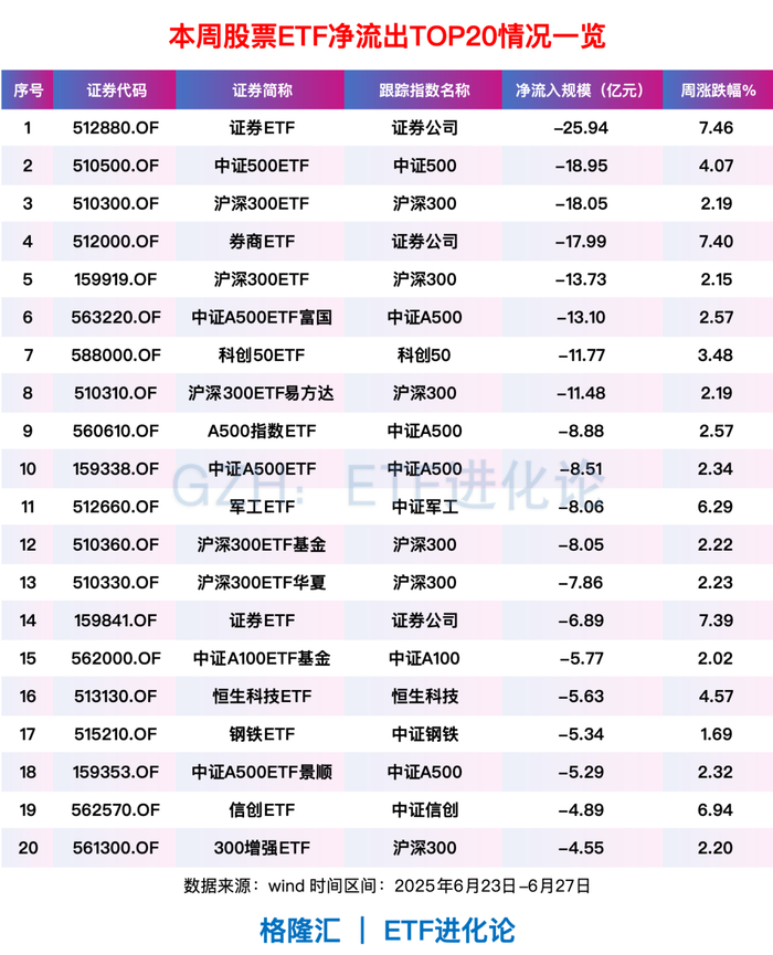 证券主题ETF和沪深300ETF遭资金抛售,证券ETF、券商ETF净流出50.82亿元。沪深300ETF、中证A500ETF富国、沪深300ETF易方达等本周合计净流出99.49亿元。