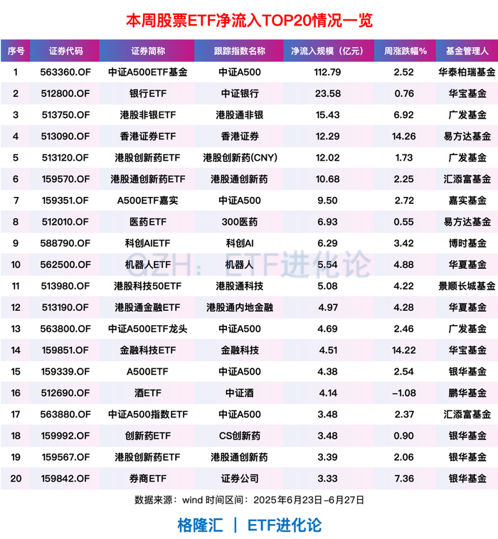 多只金融主题ETF和港股创新药ETF继续“吸金”,华宝中证银行ETF、广发港股非银ETF、易方达香港证券ETF、广发港股创新药ETF和汇添富港股通创新药ETF分别净流入23.58亿元、15.43亿元、12.29亿元、12.02亿元、10.68亿元。