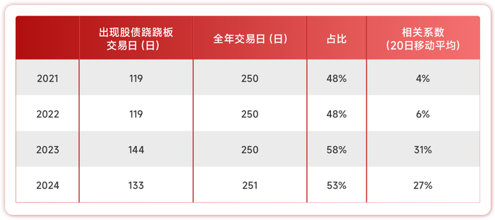 首先,从股债跷跷板出现的概率来看,WIND数据显示,2021-2022年出现股涨债跌或股跌债涨的交易日占全年交易日的比例维持在48%附近,2023-2024年升至50%以上。