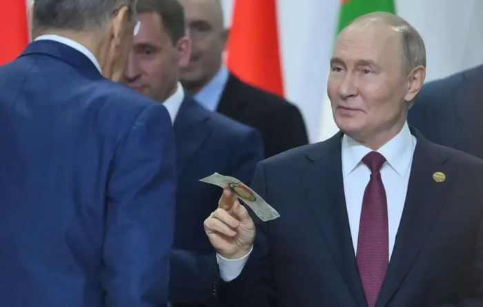 ▲俄罗斯总统普京在2024年喀山金砖国家峰会期间展示了一张“金砖国家钞票”票样。