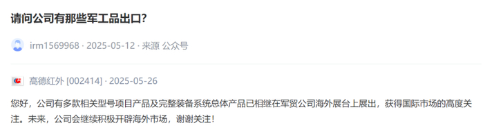 高德红外 [002414] :公司有多款相关型号项目产品及完整装备系统总体产品已相继在军贸公司海外展台上展出,获得国际市场的高度关注。未来,公司会继续积极开辟海外市场。