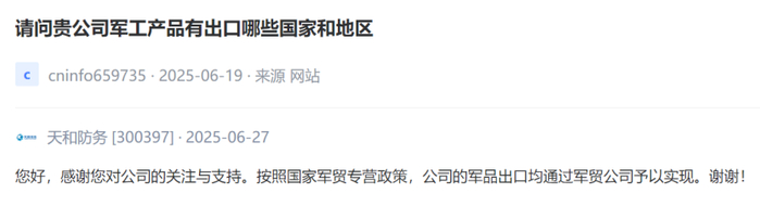 天和防务 [300397] :按照国家军贸专营政策,公司的军品出口均通过军贸公司予以实现。
