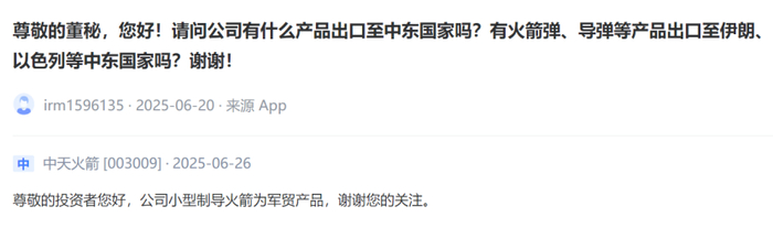 【投资者问】公司有什么产品出口至中东国家吗?有火箭弹、导弹等产品出口至伊朗、以色列等中东国家吗?