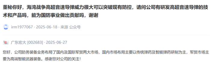 【投资者问】公司有研发高超音速导弹的技术和产品吗,能为国防事业做出贡献吗?