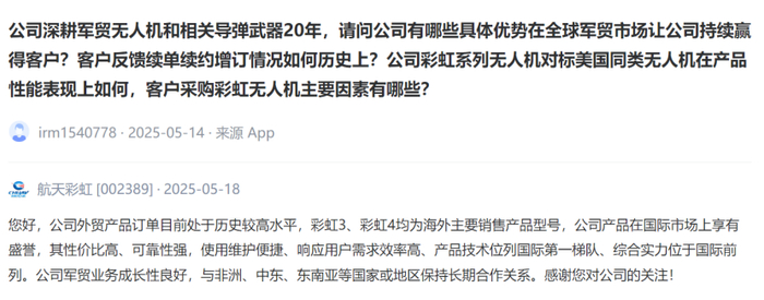 【投资者问】公司深耕军贸无人机和相关导弹武器20年,请问公司有哪些具体优势在全球军贸市场让公司持续赢得客户?客户反馈续单续约增订情况如何历史上?公司彩虹系列无人机对标美国同类无人机在产品性能表现上如何,客户采购彩虹无人机主要因素有哪些?