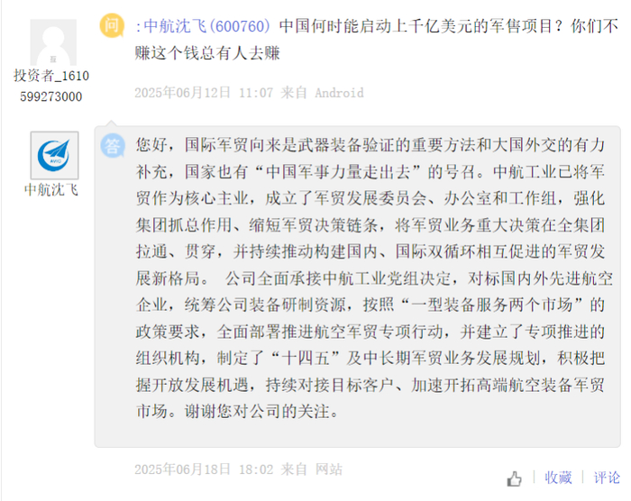 【投资者问】公司是否有军贸业务?过往军贸收入占比如何?2025年关联交易公告中集团内销售商品是否代表军贸业务放量?