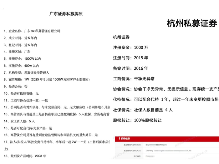 还有一家广东XX私募,则优质很多,最后一次发产品是2023年,今年5月底还有1000万存续资金,不过这块牌照相对更贵,95万元。