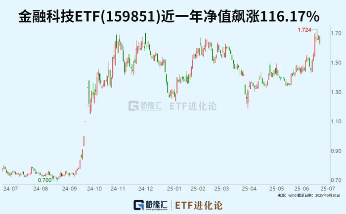 截至2025年6月30日,金融科技ETF(159851)近一年净值飙涨116.17%,在全市场指数基金中登顶冠军宝座。