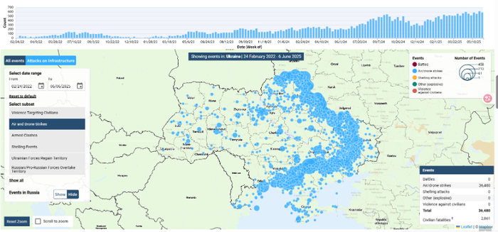 可以看到,这个频率下降了一半还要多,随着战争进入到消耗战以及这两年无人机发展的速度实在是太快了,所以无人机的频率增长非常快。从蓝色这张图中就可以看到,在2022年的时候,无人机空袭的周度频率基本上都在150次以下,但是截至最新的数据,这个频率已经到达了593次,增长了3倍左右。