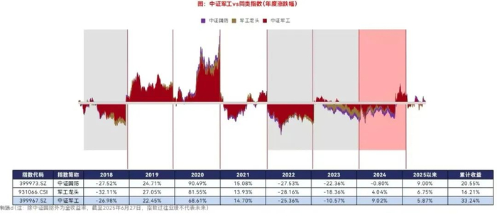 怎么理解进攻有力?在行情比较好的时候,比如大盘有上涨动力或者军工行业有一个比较好的投资机会的时候,中证军工的表现也是比较让人满意的。中证军工收益率在2024年的优势比较显著,在2019年、2020年非常少见的高级别行情里面,它的涨幅也是比较大的,虽然说可能排名不是第一,但是如果从涨幅去看的话也是非常优秀的。