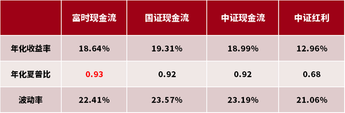 跟同类型现金流指数相比,在年化收益、波动率、最大回撤都不相上下的情况下,富时现金流指数的年化夏普比为0.93,是同类型指数中最高的;