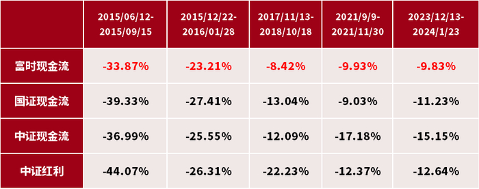 而且,富时现金流指数在市场回调的时候,往往也表现得更优异。在市场五个回调时间段中,富时现金流指数的“抗跌”能力都可圈可点!