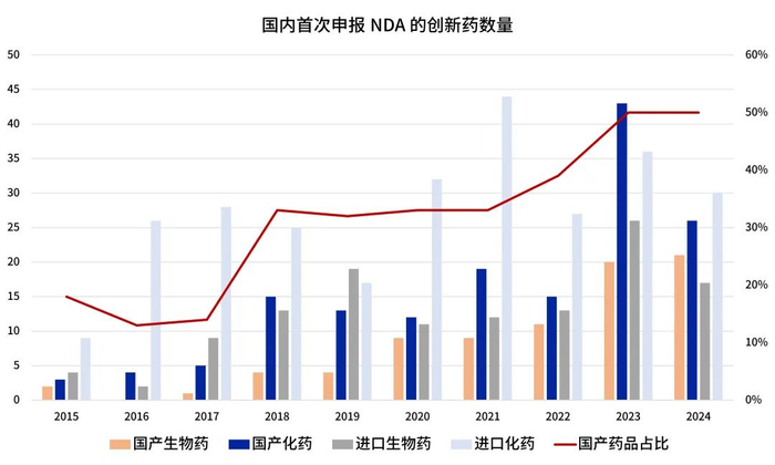 创新药属于典型的先投入后产出的行业,从研发到上市需要较长周期。国内创新药大规模研发投入自2015年药审改革开始,已经10年左右时间。如今创新药正进入价值兑换期的新阶段。2015年-2024年在国内首次申报NDA的创新药数量(新分子实体和复方,不含中药和疫苗)逐年增加,且国产创新药占比不断提升,已经占据国内创新药NDA的半壁江山。