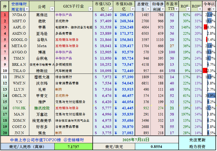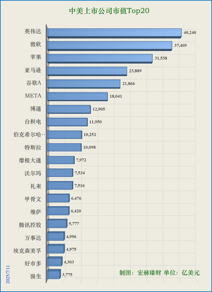 周览·市值 | 中美上市公司市值Top20(2507011)英伟达市值站上4万亿