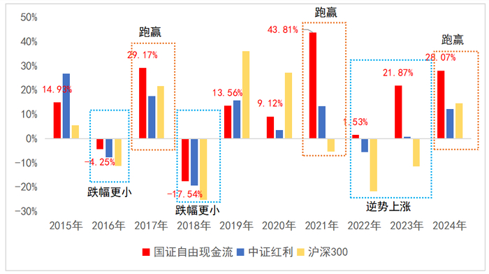 Wind数据显示,截至今年7月7日,国证自由现金流指数自2012年12月31日基日以来累计上涨363.26%,大幅跑赢同期中证红利(123.56%)及沪深300(59.88%)表现。(上述指数区间年化涨幅分别为13.45%、6.84%、3.94%,指数过往数据不代表未来表现,不等于产品实际收益及未来收益,基金有风险,投资须谨慎。)