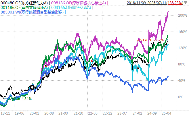 东方红新动力(周云)、富国文体健康(林庆)、淳厚信睿核心精选(陈文)、鹏华弘嘉(汤志彦),在2019-2021年的核心资产牛市中表现不比“偏股混合型基金指数”差,之后也跟着回调了不少,但都在7月份创了历史新高。