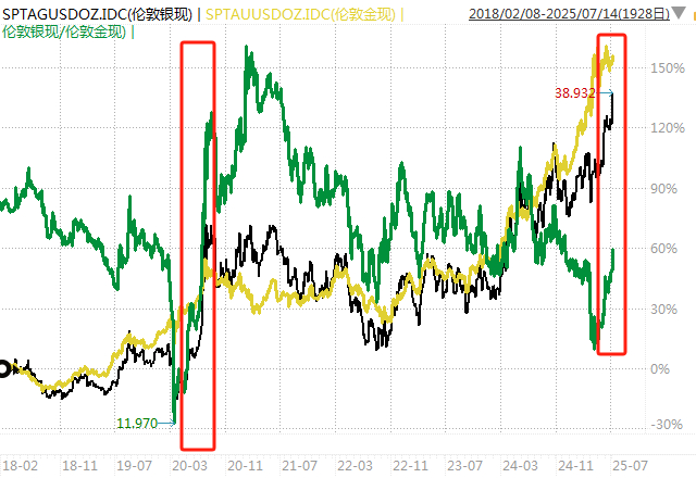 这一幕在2020年也出现过,2020年3月19日到8月10日,黄金涨了36.39%,白银涨了143.34%,金银比在达到极致后,以白银涨幅遥遥领先的形式修复了金银比。