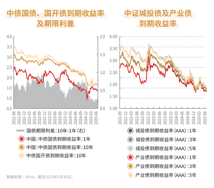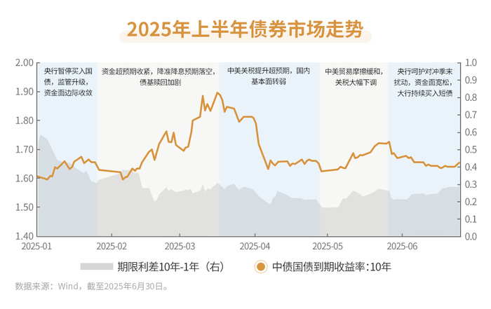 就国内债市而言,2025年上半年债市表现先抑后扬,10年期国债活跃券收益率在年初下行突破1.60%后回调至1.90%高位,随后回落至1.65%附近震荡。