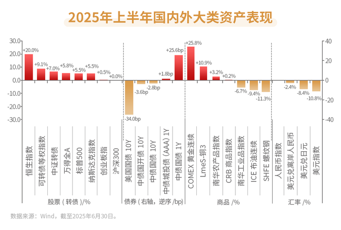 2025年上半年,海外不确定性成为影响宏观经济和金融市场的重要因素。海外方面,美国4月初对多国大幅加征关税,但此后又显著降低关税加征幅度,导致金融市场大幅波动。关税不确定性一方面促使海外企业抢进口补库,另一方面也加剧了美国通胀回升风险,美联储维持观望态度,降息上半年未能落地。国内方面,抢出口及消费补贴政策对基本面形成支撑,但产销率偏低拖累了通胀修复,经济修复仍存结构性。大类资产走势上,海外权益市场先跌后涨大幅波动,美债利率高位震荡,贵金属大幅上涨;国内权益市场结构性分化,红利、小盘成长杠铃型两端占优,而债券市场则先跌后涨,呈现震荡格局。