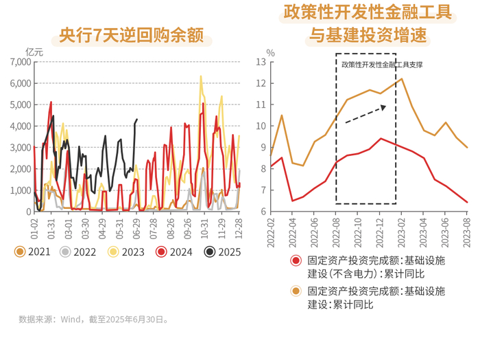 展望2025年下半年,货币政策仍有增量实施空间但节奏仍然较难预判,三季度后半段或是较合意的宽松窗口期。首先,基本面走弱是触发新一轮宽松的必要条件。随着外需的影响逐步显化,叠加高基数效应,消费和基建进一步发力的必要性增加;其次,三季度后半段政府债或迎来供给高峰,财政发力需要宽松的流动性环境;其三,目前市场预期美联储于9月降息的概率较高,届时将为国内货币政策的实施提供有利的外部环境。在工具使用上,央行将继续综合运用多种货币政策工具,同时新型政策性金融工具有望加快落地。