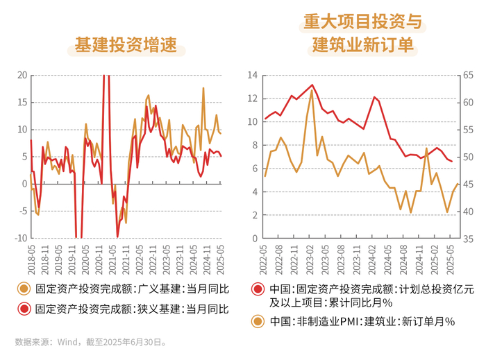 基建投资或是下半年财政发力对冲外需的重要抓手,预计资金和项目端均较上半年更为积极,基建投资增速有望提升。2025年上半年基建投资增速较2024年回升,但化债对地方政府基建投资继续形成制约,广义和狭义基建增速之差维持高位。