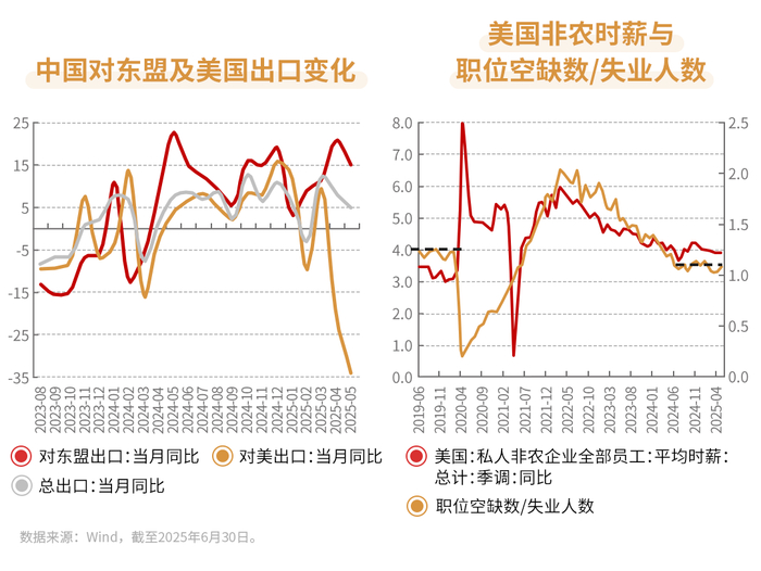 2025年特朗普关税政策对全球贸易产生巨大影响。2024年11月特朗普在总统大选中胜选以来,市场对关税加征已有预期,抢出口现象显现,我国对美出口增速中枢明显抬升。但4月美国对等关税力度仍大超预期,对我国关税一度加增至145%,我国对美出口连续大幅下滑。但此后中美谈判取得进展,关税摩擦整体缓和,抢出口、抢转口形成对外需支撑。结构上,我国对新兴市场出口增速明显,出口经东盟等“产业链协作型”国家转口的量激增,为上半年经济增长的重要驱动。后续关键关税政策节点或在7月至8月中旬。