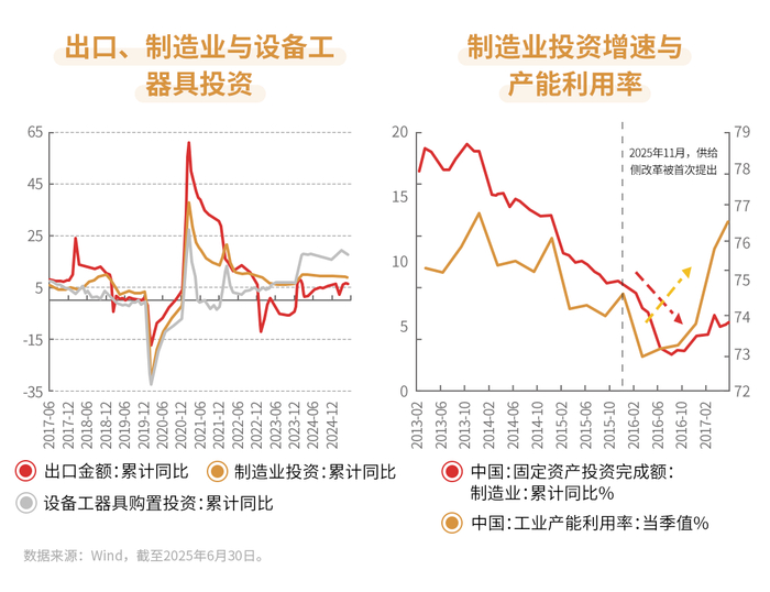 下半年制造业投资增速可能高位回落。一方面,外需回落或拖累制造业投资增长。下半年出口下行压力可能增大,叠加产能利用率偏低,物价偏弱也将制约企业营收利润修复,或对制造业投资造成压力。另一方面,“反内卷”淘汰落后产能或对制造业投资增长形成制约,但力度上较2015年供给侧改革或相对温和。政治局会议、中央经济工作会议及全国两会多次提出治理“内卷式”恶性竞争,近期中央财经委会议也强调要依法依规治理企业低价无序竞争、推动落后产能有序退出。上半年政策细化,《全国统一大市场建设指引(试行)》发布,明确禁止地方政府以税收减免、土地特惠等超常优惠制造“政策洼地”。