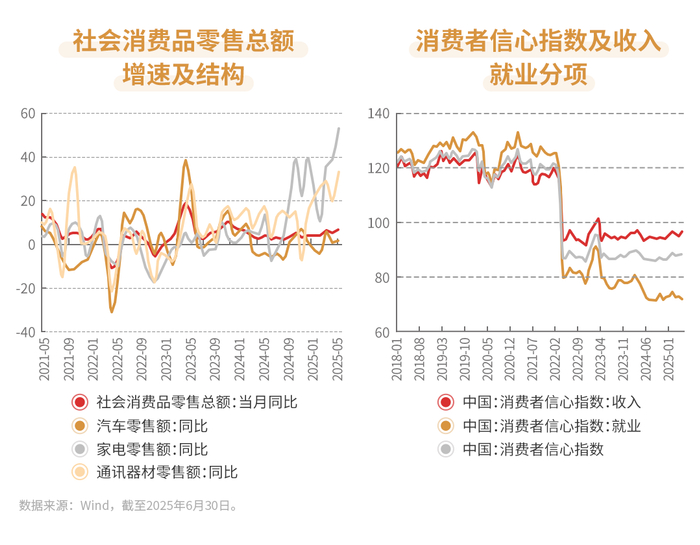 从2025年上半年消费的驱动因素来看,政策补贴形成主要支撑,但考虑到耐用消费品更新周期较长,此前持续受益于政策利好的汽车零售相较于新纳入补贴范围的通信器材、家电零售已明显偏弱,下半年汽车、通信、家电等耐用品消费支持政策效果或逐步退坡。此外,居民内生性消费动能不足的中长期问题持续,居民可支配收入改善有限,消费者信心指数收入、就业分项仍明显低于2022年以前。
