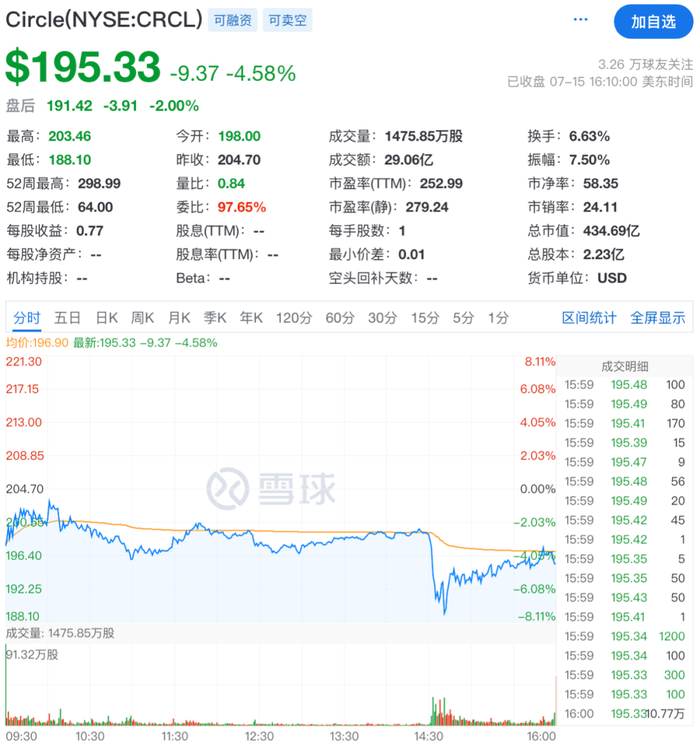 受此影响,美股加密货币概念股集体下挫,全球第二大稳定币发行商Circle Internet股价大幅跳水,盘中一度大跌超8%,最终收跌4.58%,Robinhood、Coinbase亦集体收跌。
