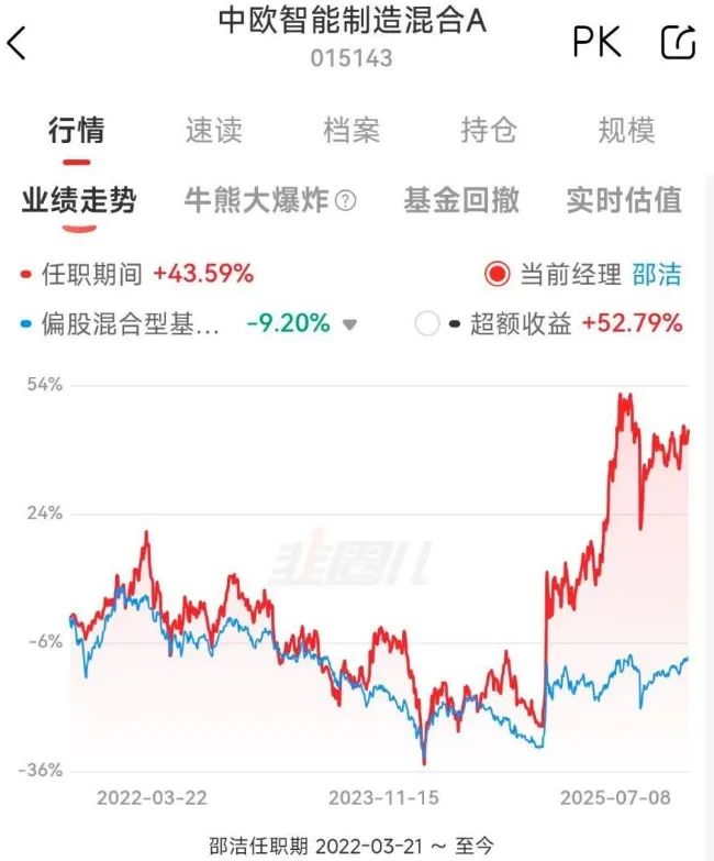 邵洁拥有丰富的从业经历,历任国金证券、安信证券电子行业高级分析师,2016年加入中欧基金,从研究员成长为基金经理,现管理中欧科创主题、中欧智能制造等3只偏股型产品。以她管理的中欧智能制造为例,该基金成立于2022年3月,截至2025年7月8日收益达43.59%,远超同期偏股混合指数(-9.20%)和TMT50指数(2.68%)。其超额收益主要集中在2022年下半年和924行情启动后,对应新能源和科创半导体行业高景气周期。