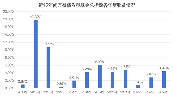 回顾过往的数据可以发现,Wind数据显示,从2013年到2024年的12年间,万得债券型基金总指数均获得的年度正收益,各年度收益率平均数达4.97%,而在2014年、2015年的涨幅达到17.82%和10.77%。