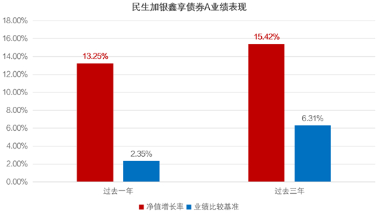 民生加银鑫享债券在多个时间维度下均表现突出,A类份额近3年、近1年净值增长率分别为15.42%和13.25%,均优于同期业绩比较基准(6.31%和2.35%),超额收益显著。