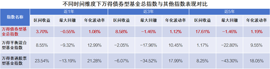 正如债券基金,主投债券资产,受股票市场波动的影响较小,相较于混合基金和股票基金过往表现也更加低波。据Wind数据显示,万得债券型基金总指数虽近1年的短期收益低于万得平衡混合型基金指数和万得普通股票型基金指数,但拉长时间来看,近3年、近5年,其区间收益却展现出较为明显的优势,且区间最大回撤和年化波动率始终保持在较低水平。