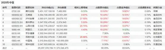 在规模收缩的情况下,张坤继续维持着自己的重仓股组合和权益仓位。